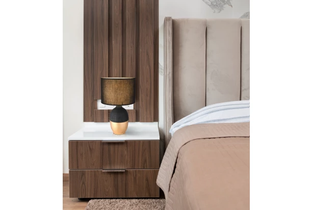 Táto elegantná stolná lampa zaujme svojim krásnym designom. Na oválnom keramickom podstavci v čierno-zlatej farbe je pätica E14, ktorou prekrýva čierne textilné tienidlo s priemerom 25 cm. Vďaka svojmu unikátnemu vzhľadu sa stane nielen štýlovým prvkom, ale aj praktickým zdrojom svetla na rôzne účely. Celková výška 43 cm.