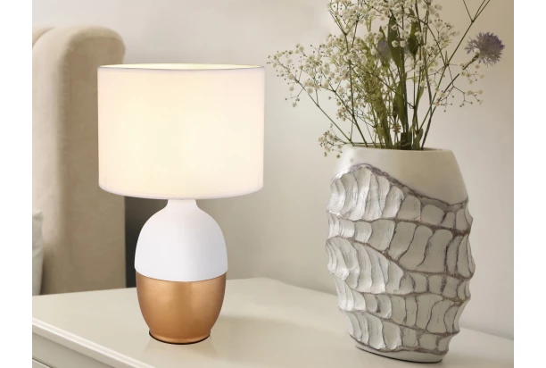 Táto elegantná stolná lampa zaujme svojim krásnym designom. Na oválnom keramickom podstavci v bielo-zlatej farbe je pätica E14, ktorú prekrýva biele textilné tienidlo s priemerom 25 cm. Vďaka svojmu unikátnemu vzhľadu sa stane nielen štýlovým prvkom, ale aj praktickým zdrojom svetla na rôzne účely. Celková výška 43 cm.