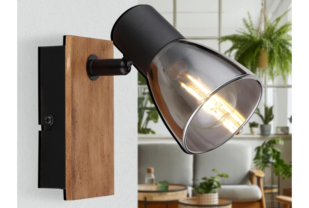 Nástenné svietidlo zo série Claude zaujme svojim dizajnom a poskytne príjemné osvetlenie v spálni alebo obývacej izbe, možno ho tiež použiť ako osvetlenie nástenného obrazu. Bodová lampa je vyrobená z čierneho kovu a dymového skla. Hranatú základňu dopĺňa štýlový drevený prvok.