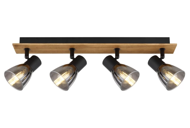 Stropné osvetlenie zo série Claude zaujme svojim dizajnom a poskytne príjemné osvetlenie v spálni alebo obývačke. Lampa so 4 svietidlami je vyrobená z čierneho kovu a dymového skla. Hranatú základňu dopĺňa štýlový drevený prvok. Celková dĺžka 50 cm.