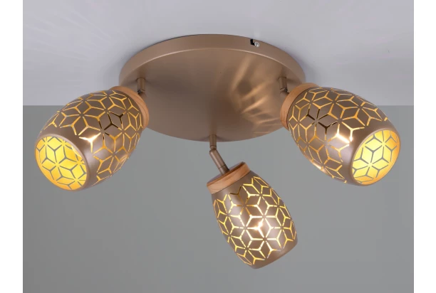 Stropná lampa s 3 svietidlami v kávovo-medenom kove vnesie do vášho domova hrejivú atmosféru a stane sa elegantnou dominantou miestnosti. Jemné svetlo prenikajúce cez dekoratívne vzory vytvára jedinečnú hru svetla a tieňov, ktorá zútulní celý priestor. Prírodné drevené prvky podčiarkujú celkový pocit tepla a harmónie.