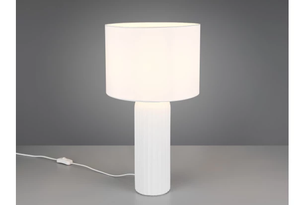 Elegantná stolná lampa sa vďaka svojim čistým líniám ľahko začlení do akéhokoľvek interiéru. Či už ju umiestnite na nočný stolík v spálni, do obývacej izby či predsiene, jej jemné svetlo a vycibrený dizajn vytvárajú pokojnú, príjemnú atmosféru. Telo lampy je vyrobené z matne bielej keramiky, ktorú dopĺňa biele látkové tienidlo zvýrazňujúce jej ľahkosť a eleganciu. Výška 51 cm.