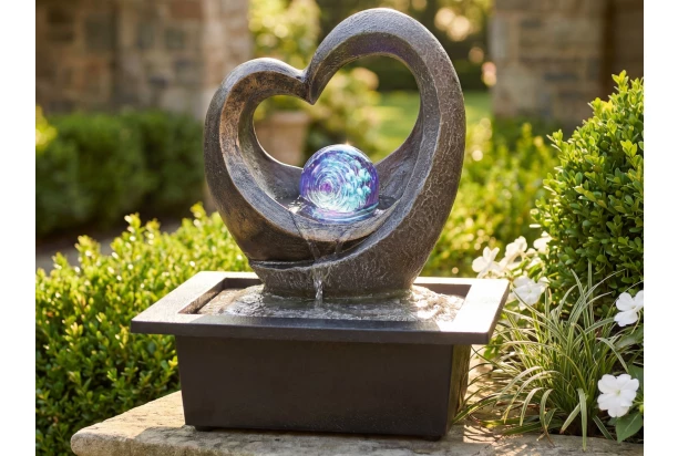 Dizajnová vodná fontána v tvare srdca so svetelnou guľou na podstavci vnesie do vášho domova či záhrady upokojujúcu atmosféru plnú harmónie. Jemné šumenie vody a fascinujúce farebné RGB osvetlenie je ideálnym doplnkom na relaxáciu, meditáciu alebo ako štýlová dekorácia.