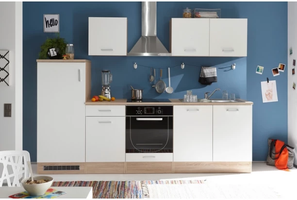 Praktický kuchynský blok s celkovou šírkou 270 cm v kombinácii dub sonoma a bielej farby vytvorí príjemné domácke prostredie v kuchyni. Bočnú úložnú skriňu môžete naviac individuálne doplniť aj o vstavanú chladničku.