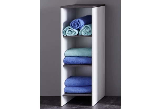 Nízky regál z radu California v kombinácii bielej farby a dymovo sivého duba prakticky poslúži v moderne i klasicky zariadenej kúpeľni, prípadne kdekoľvek inde.