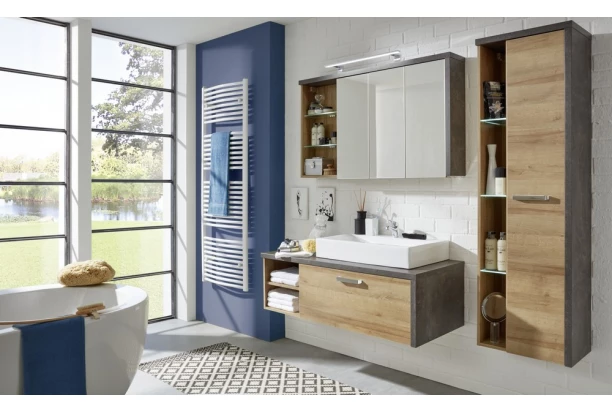Kúpelňová vysoká skrinka Bay, dub/tmavosivý betón
