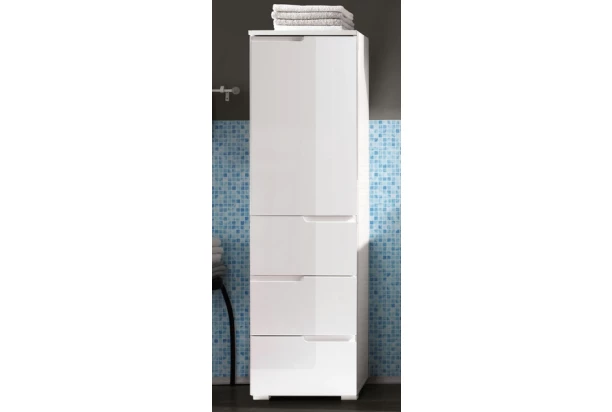 Kúpeľňová vyššia skrinka z modelového radu Spice. Lesklo biele predné plochy s extravagantnou zaoblenou profiláciou sa ideálne hodí do nadčasovo zariadenej kúpeľne.