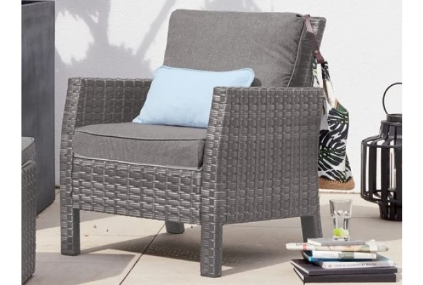 Elegantné kreslo obsahuje komfortne mäkké vankúše pre príjemné posedenie na záhrade alebo tiež kdekoľvek v interiéri.