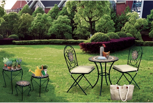 Kovová záhradná súprava s motívom zelenej mozaiky nájde svoje miesto nielen na vonkajšej záhrade a balkóne, ale aj v interiéri. Obsahuje guľatý stolík a 2 skladacie stoličky.