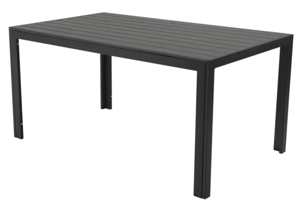 Moderný obdĺžnikový záhradný stôl o rozmere 150×90 cm má stabilnú konštrukciu z antracitového kovu a jedálenskú plochu z imitácie šedého dreva. Je praktický pre jeho ľahkú údržbu vo vonkajšom prostredí.