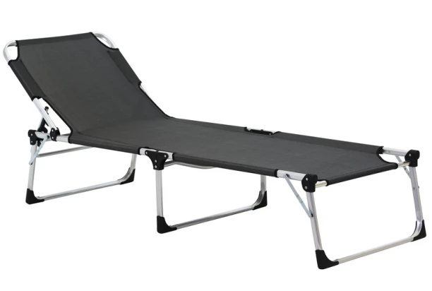 Záhradné ležadlo v kombinácii kovu a antracitovej umelej tkaniny má nastaviteľnú opierku a praktickú skladaciu konštrukciu, vďaka ktorej možno ľahko prenášať.