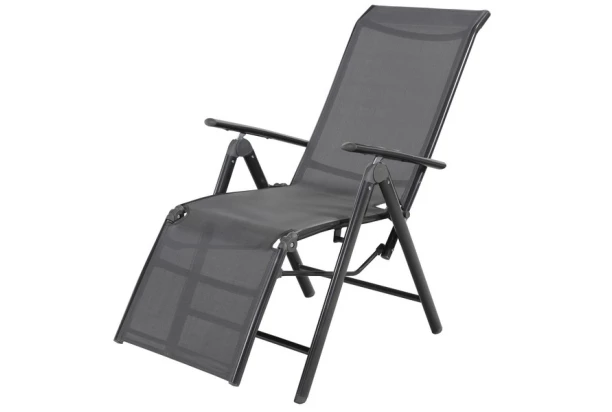 Univerzálne záhradné kreslo s opierkami pre chvíle pohody na slnku aj v tieni. Vďaka funkcii polohovania možno premeniť na pohodlné ležadlo na slnenie alebo relaxáciu. V kombinácii kovu a šedej umelej tkaniny.