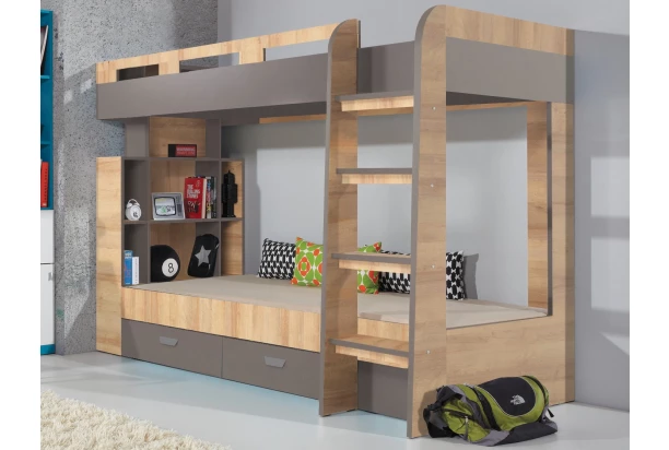 Dvojposchodová posteľ o veľkosti 90×200 cm z programu Nano obsahuje zásuvky aj regál a zaujme svojim vzhľadom v kombinácii útulného dubového dekoru a grafitovej farby. Hodí sa pre vybavenie izby detí, tínedžerov i dospelých.