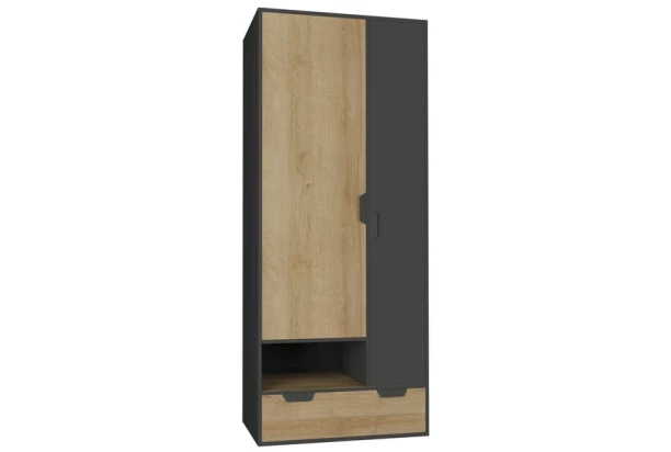 Šatníková skriňa z programu Nano obsahuje praktické úložné priestory a zaujme svojím vzhľadom v kombinácii útulného dubového dekoru a grafitovej farby. Hodí sa pre vybavenie izby detí, tínedžerov i dospelých.