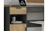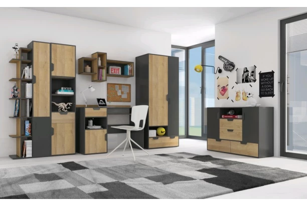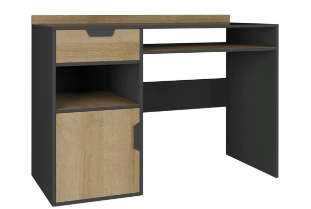 Písací stôl z programu Nano obsahuje množstvo praktických úložných priestorov a zaujme svojím vzhľadom v kombinácii útulného dubového dekoru a grafitovej farby. Hodí sa pre vybavenie izby detí, tínedžerov i dospelých.