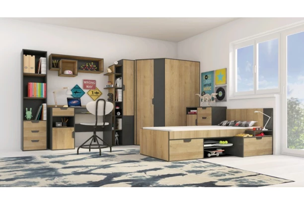 Polica z programu Nano obsahuje praktické úložné priestory a zaujme svojím vzhľadom v kombinácii útulného dubového dekoru a grafitovej farby. Hodí sa pre vybavenie izby detí, tínedžerov i dospelých.
