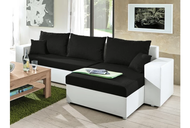 Rohová sedacia súprava v kompaktných rozmeroch, možné univerzálne zostaviť ako pravý/ľavý roh. Ľahko ju tak umiestnite do akejkoľvek miestnosti. Potiahnutá kombináciou bielej ekokože a čiernej látky.