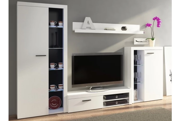 Obývacia stena v trendovom štýle ponúka praktické úložné priestory aj otvorené priehradky na umiestnenie dekoračných predmetov alebo elektroniky. Vyrobená vo farbe biela. Vnútorné sklenené police je možné navyše individuálne doplniť LED osvetlením.