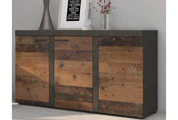 Komoda 3-dverová so šírkou 149 cm v trendovom štýle, ponúka praktické úložné priestory, ktoré môžete využiť na všestranné ukladanie. Vo vintage optike obrúseného kovu a drevených lát.