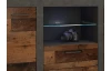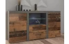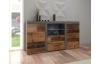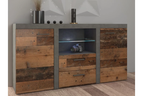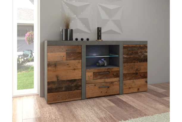 Komoda v trendovom štýle ,ponúka praktické úložné priestory aj otvorené priehradky na umiestnenie dekoračných predmetov alebo elektroniky, navyše so zásuvkami uprostred. Vo vintage optike obrúseného kovu a drevených lát. Sklenenú policu je možné doplniť osvetlením a vytvoriť si tak príjemnú večernú atmosféru.
