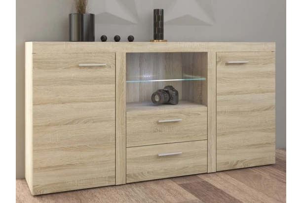 Komoda v trendovom štýle ponúka praktické úložné priestory aj otvorené priehradky na umiestnenie dekoračných predmetov alebo elektroniky, navyše so zásuvkami uprostred. Vyrobená v dekore dub sonoma. Vnútornú sklenenú policu je možné navyše individuálne doplniť LED osvetlením.