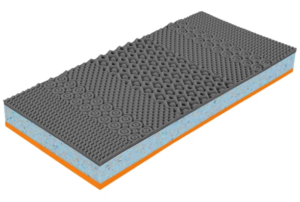 - stredová vrstva: objemná zosilnená stredná časť – pena Flexifoam® RE72, vysoká objemová hmotnosť cca 72 kg / m3, vysoká nosnosť, tuhosť a odolnosť