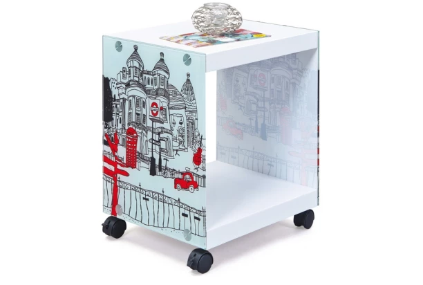 Praktický odkladací stolík alebo regálik je ideálnym doplnkom do mladistvo zariadeného bytu. Zaujímavé sklenené steny s kreatívnym londýnskym motívom zaujmú. Vďaka spodným kolieskam možno ľahko premiestniť.