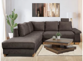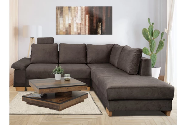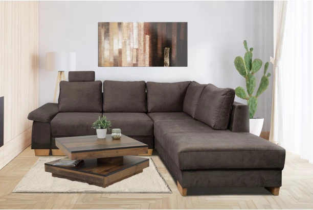 Komfortná a priestranná rohová sedacia súprava s veľkými opornými vankúšmi, funkciou rozkladu na lôžko aj úložným priestorom. Potiahnutá do príjemne mäkkej látky so zvýšenou odolnosťou vo farbe hnedá. Pohodlné sedenie dopĺňa navyše opierka hlavy, ktorú je možné ľubovoľne umiestniť na akékoľvek miesto. Variant sedačky tvorí s otomanom pravý roh.