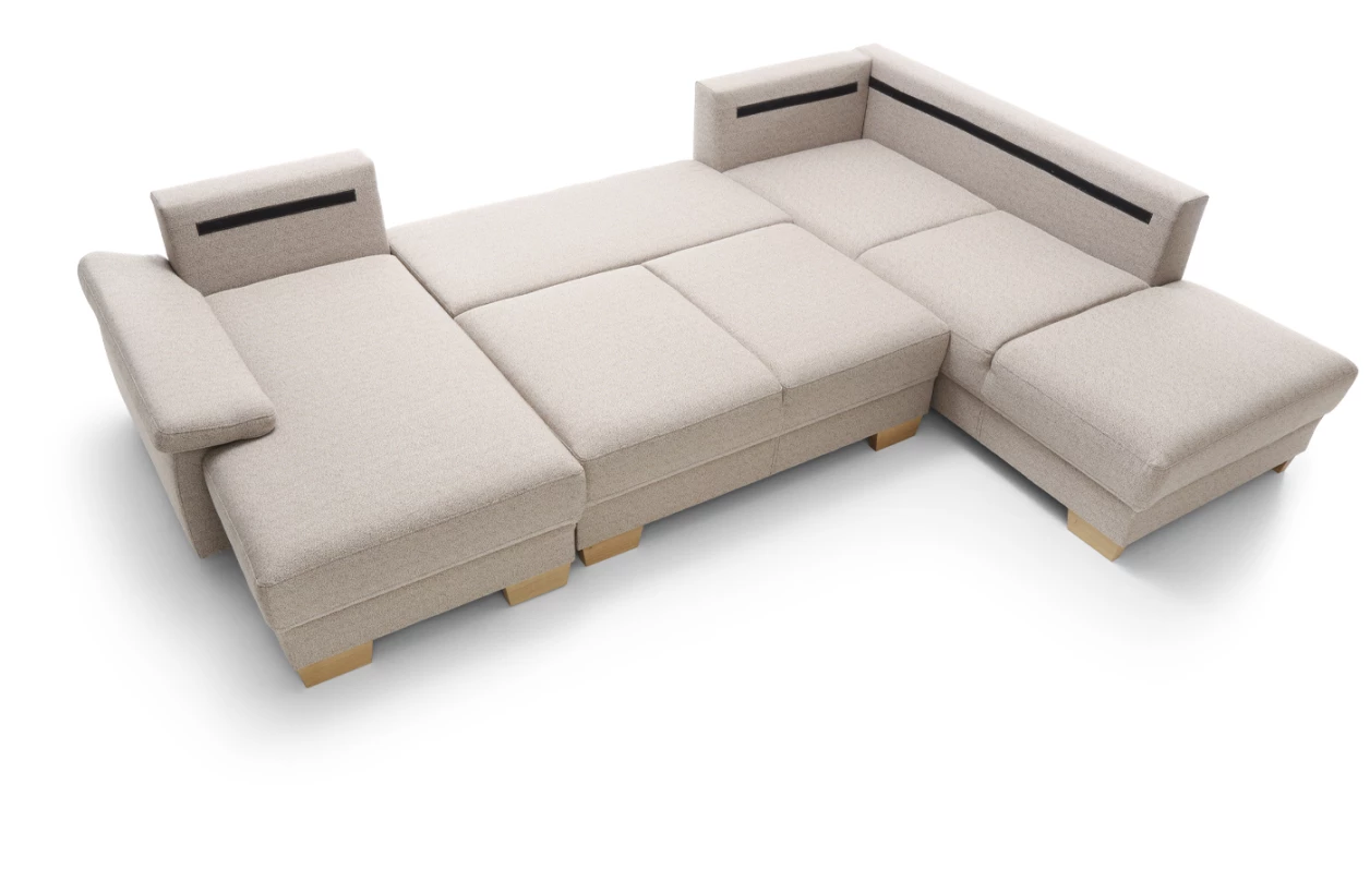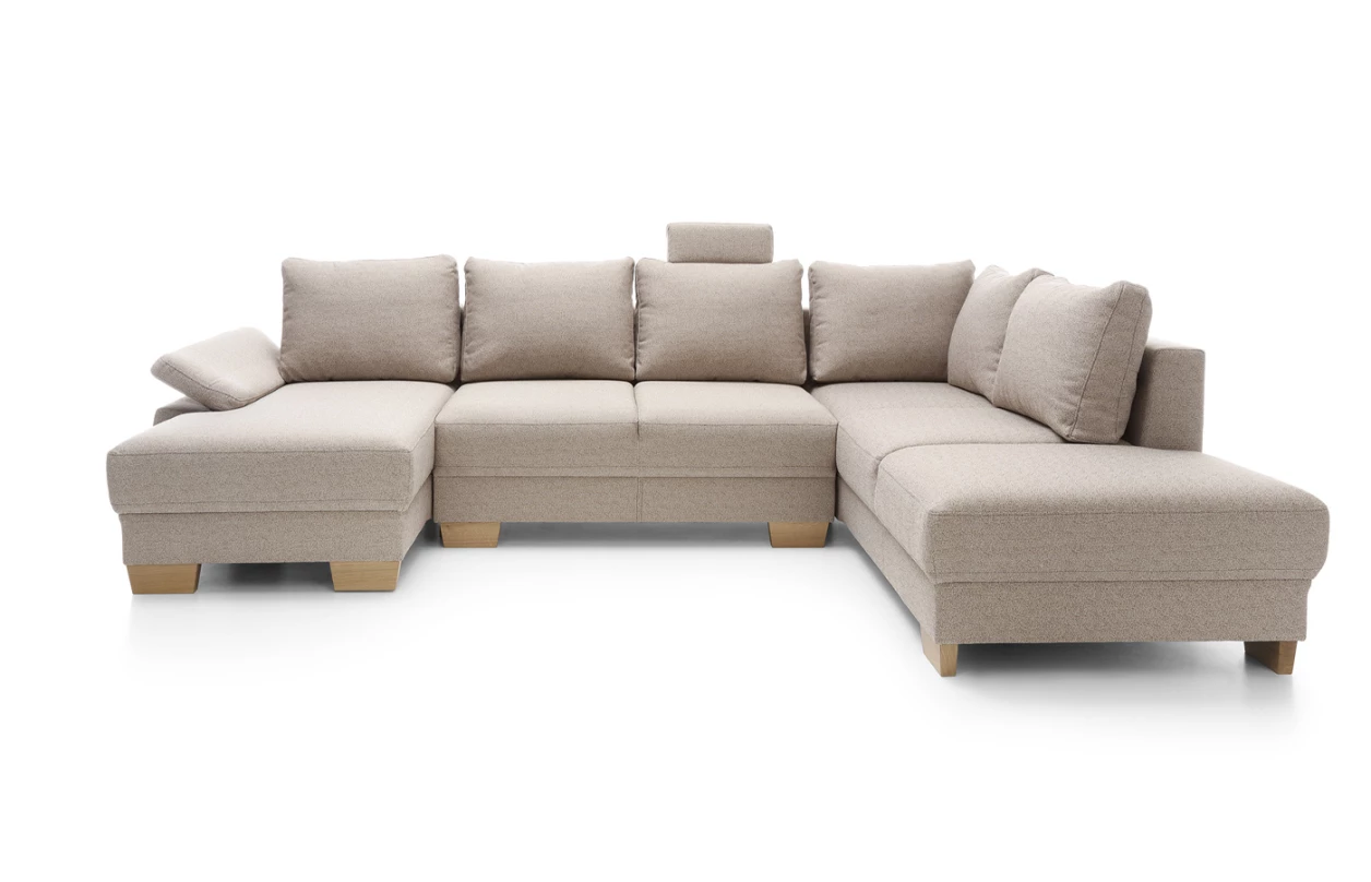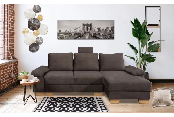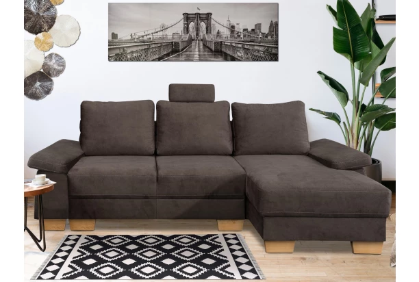 Komfortná rohová sedačka s veľkými opornými vankúšmi, funkciou rozkladu na lôžko aj úložným priestorom. Potiahnutá do príjemne mäkkej látky so zvýšenou odolnosťou vo farbe hnedá. Pohodlné sedenie dopĺňa navyše opierka hlavy, ktorú je možné ľubovoľne umiestniť na akékoľvek miesto. Variant sedacej súpravy tvorí s otomanom pravý roh.