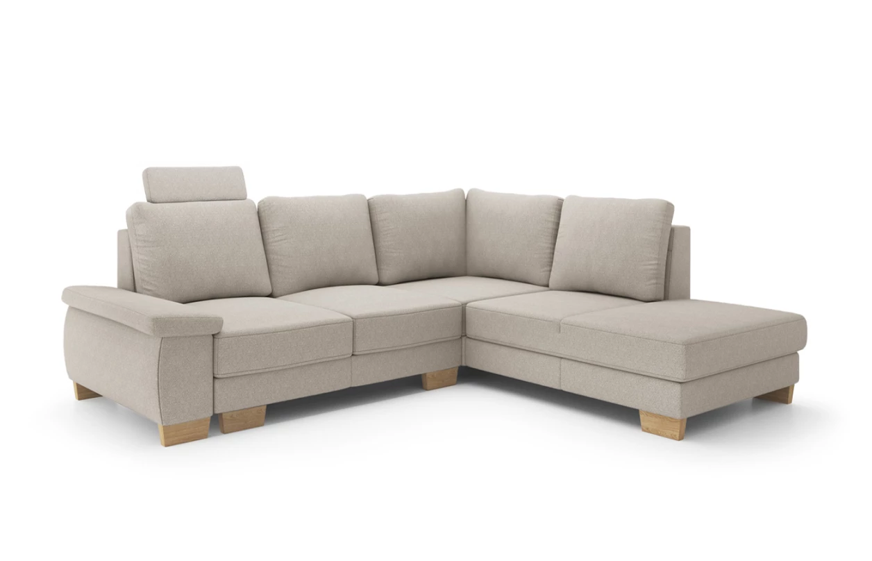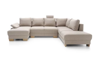 Komfortná a priestranná sedacia súprava v tvare ľavej U s veľkými opornými vankúšmi, funkciou rozkladu na lôžko aj úložným priestorom. Potiahnutá látkou vo vintage optike kože v odtieni koňakovo hnedá. Pohodlné sedenie dopĺňa navyše opierka hlavy, ktorú je možné ľubovoľne umiestniť na akékoľvek miesto.