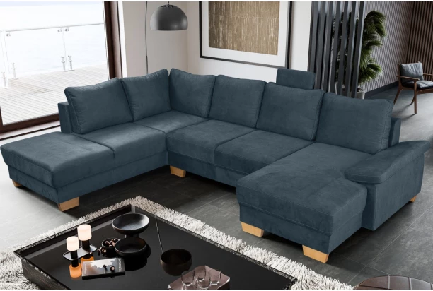 Komfortná a priestranná sedacia súprava v tvare ľavé U s veľkými opornými vankúšmi, funkciou rozkladu na lôžko aj úložným priestorom. Potiahnutá mäkkou a jemne štruktúrovanou látkou vo farbe petrolejovo modrá. Pohodlné sedenie dopĺňa navyše opierka hlavy, ktorú je možné ľubovoľne umiestniť na akékoľvek miesto.