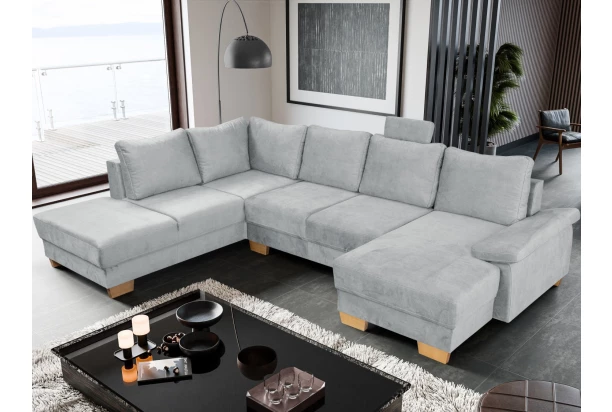 Komfortná a priestranná sedacia súprava v tvare ľavej U s veľkými opornými vankúšmi, funkciou rozkladu na lôžko aj úložným priestorom. Potiahnutá mäkkou a jemne štruktúrovanou látkou vo farbe svetlo šedá. Pohodlné sedenie dopĺňa navyše opierka hlavy, ktorú je možné ľubovoľne umiestniť na akékoľvek miesto.