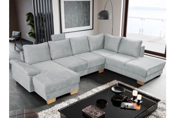 Komfortná a priestranná sedacia súprava v tvare pravej U s veľkými opornými vankúšmi, funkciou rozkladu na lôžko aj úložným priestorom. Potiahnutá mäkkou a jemne štruktúrovanou látkou vo farbe svetlo šedá. Pohodlné sedenie dopĺňa navyše opierka hlavy, ktorú je možné ľubovoľne umiestniť na akékoľvek miesto.