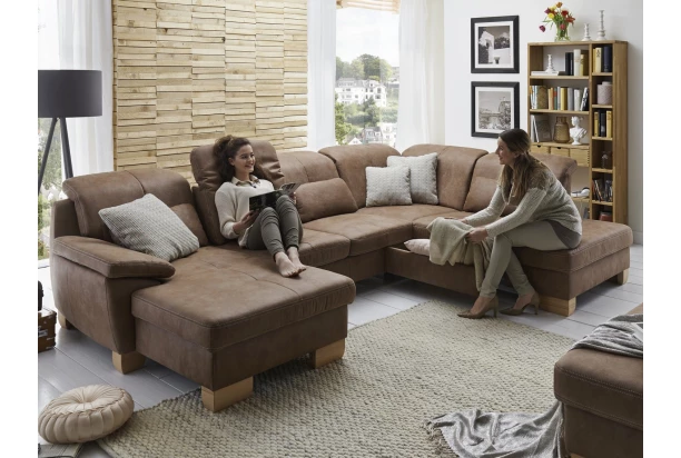 Sedacia súprava Garland v tvare U ľahko splní Vaše očakávania na komfort počas každodenného sedenia alebo odpočinku. Priestranné sedenie dopĺňajú kvalitne vypolstrované vysoké operadlá s polohovaním horných opierok. Táto priestranná sedačka je očalúnená zaujímavou látkou v odtieni hnedý tabak, ktorá má jemne štruktúrovaný povrch a pripomína tak optiku kože. Pri sedačke oceníte aj nôžky z masívneho dreva. Tento variant sedačky je navyše vybavený funkciami s nastavením hĺbky sedu, polohovaním podrúčky, funkciou rozkladu pre príležitostné spanie a dokonca s tromi úložnými priestormi.
