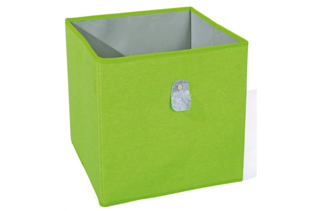 Úložný látkový box v zelenej farbe poslúži ako praktická súčasť regálu alebo vnútorného vybavenia skriniek, prípadne ho môžete umiestniť samostatne.