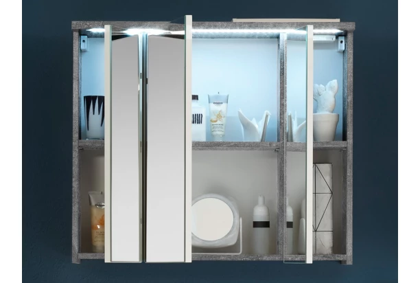 Kúpeľňová skrinka so zrkadlom z programu Pool – praktický nábytok v imitácii sivý betón sa hodí do moderne zariadenej kúpeľne. Doplnená osvetlením v hornom ráme.