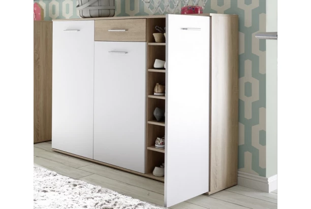 Univerzálna 3-dverová komoda so zásuvkou a mnohými vnútornými policami je ideálne využiteľná aj ako prehľadný botník. Konštrukcia o šírke 136 cm vyrobená v obľúbenej kombinácii duba sonoma a bielej farby.
