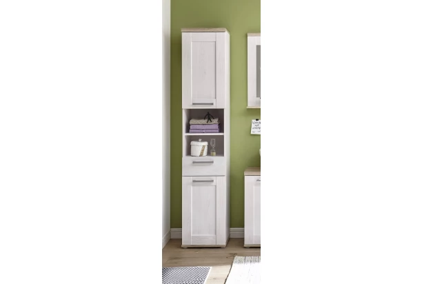Kúpeľňová vysoká skrinka z kolekcie Romance – romantické čaro nábytku v elegantnom vidieckom štýle podtrhujú dekoratívne reliéfy predných plôch a kombinácie bieleného sibírskeho smrekovca s útulnými tónmi dubového drevodekoru.