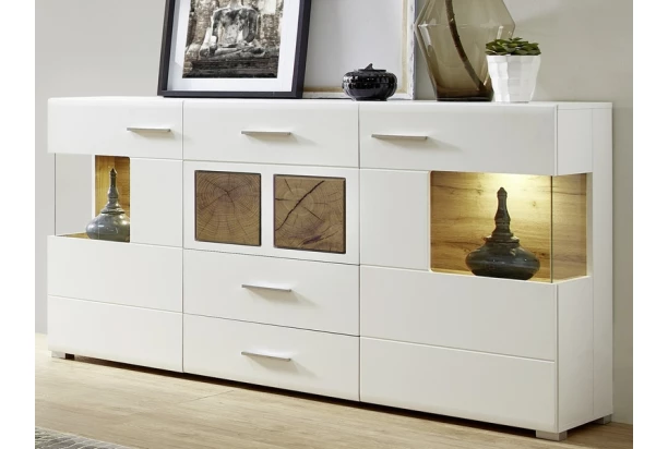 Moderná biela široká komoda s osvetlením v kombinácii s dubovým drevodekorom pre príjemný domov inšpirovaný prírodou. Štýlové aplikácie s optikou rozpraskaného dreva vytvárajú skvelý kontrast a zaujmú na pohľad. Navyše oceníte kvalitné spracovanie s tlmeným dovieraním dverí i zásuviek.