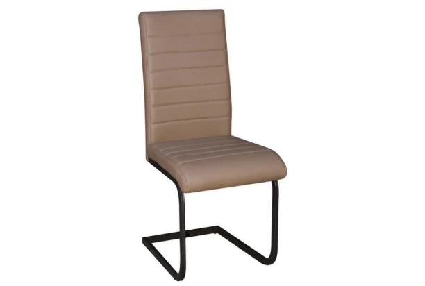 Moderná jedálenská stolička na čiernej kovovej podnoži má čalúnený sedák potiahnutý ekokožou v hnedo-šedom odtieni cappuccino.