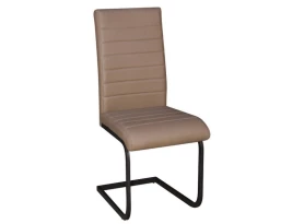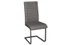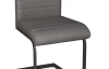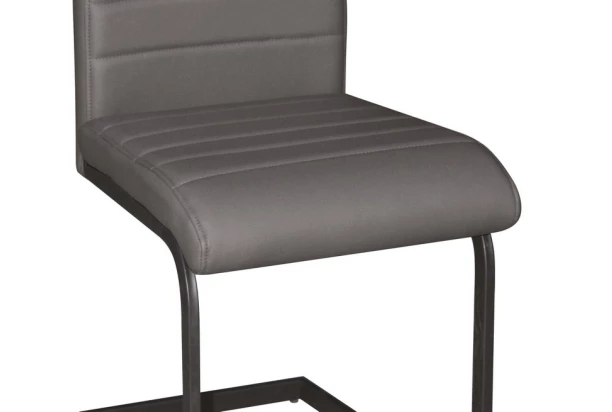 Moderná jedálenská stolička na čiernej kovovej podnoži má čalúnený sedák potiahnutý ekokožou v šedej farbe.