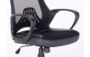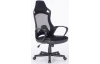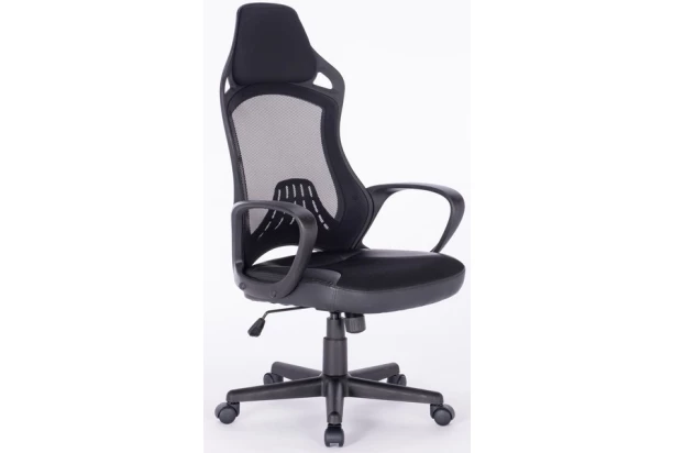 Oble tvarovaná kancelárska stolička je vybavená bedrovou opierkou a vysokým operadlom s čalúnenou opierkou hlavy. Potiahnutá kombináciou čiernej ekokože a sieťoviny pre ventiláciu v oblasti chrbta.