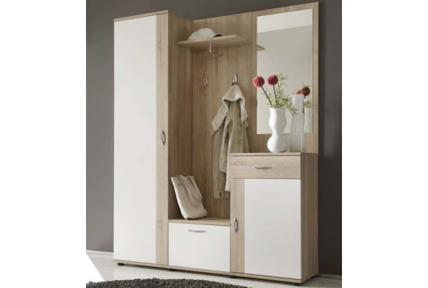 Elegantná predsieňová stena s celkovou šírkou 145 cm obsahuje všetko základné, čo potrebujete mať v každej prakticky zariadenej predsieni. Vyrobená v obľúbenej kombinácii dub sonoma s bielou farbou.
