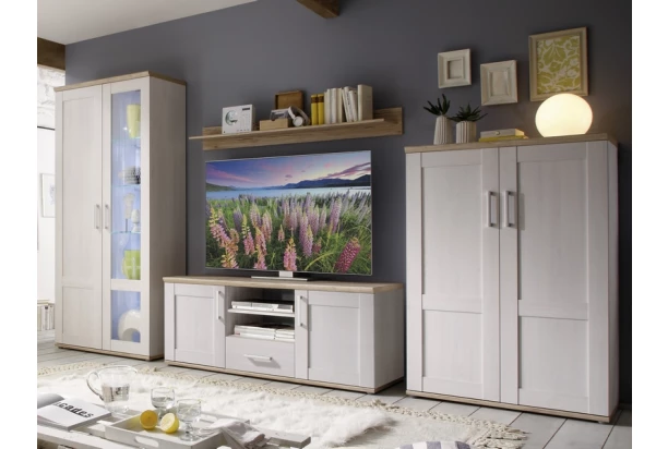 Romantické kúzlo obývacia zostavy v elegantnom vidieckom štýle podtrhujú dekoratívne reliéfy predných plôch a kombinácia bieleného sibírskeho smrekovca s útulnými tónmi dubového drevodekoru.
