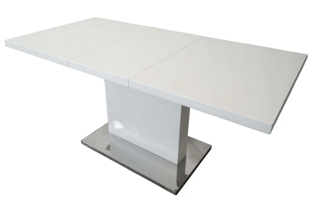 Čistý moderný štýl jedálenského stola v kombinácii bieleho lesku a chrómovo lesklého kovu sa hodí aj do menšieho priestoru jedálne alebo kuchyne – jedálenskú dosku môžete z pôvodnej šírky 120 cm rozložiť na 160 cm plochu v prípade návštevy viacerých osôb.