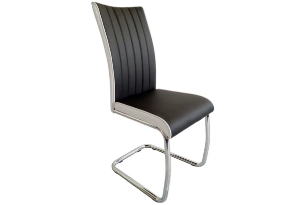 Jedálenská stolička na kovovej podnoži má zvisle prešité operadlo a zaujímavo riešený poťah v kombinácii čiernej a bielej ekokože. Dokonale sa hodí k modernému jedálenskému stolu.