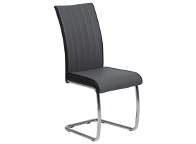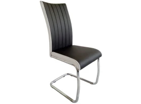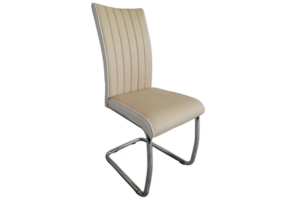 Jedálenská stolička na kovovej podnoži má zvisle prešité operadlo a zaujímavo riešený poťah v kombinácii béžovej a bielej ekokože. Dokonale sa hodí k modernému jedálenskému stolu.