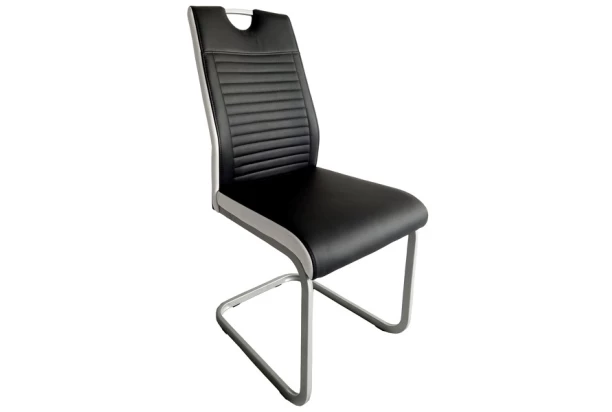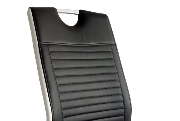 Jedálenská stolička na kovovej podnoži má vodorovne prešité operadlo a zaujímavo riešený poťah v kombinácii čiernej a bielej ekokože. Skvele sa hodí do modernej jedálne alebo kuchyne.