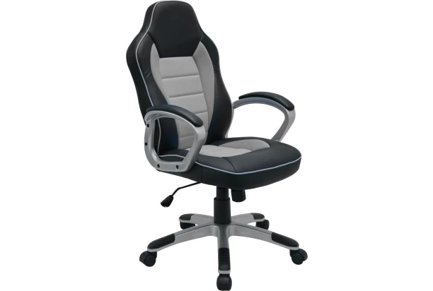 Moderné kancelárske kreslo s čalúnenými opierkami má pohodlne tvarované sedadlo v kombinácii čiernej a šedej ekokože.