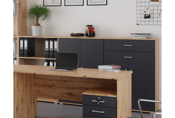 Nízky regál z kancelárskeho programu Lift – v útulnom dekore dub artisan si môžete ľahko vybaviť svoju domácu kanceláriu alebo pracovňu. Prípadne kombinovať viac kancelárskych prvkov dohromady a prispôsobiť si tak pracovný priestor podľa vlastných potrieb. Konštrukciu regálu môžete doplniť o úložné zásuvky a predné dvere z programu Lift.